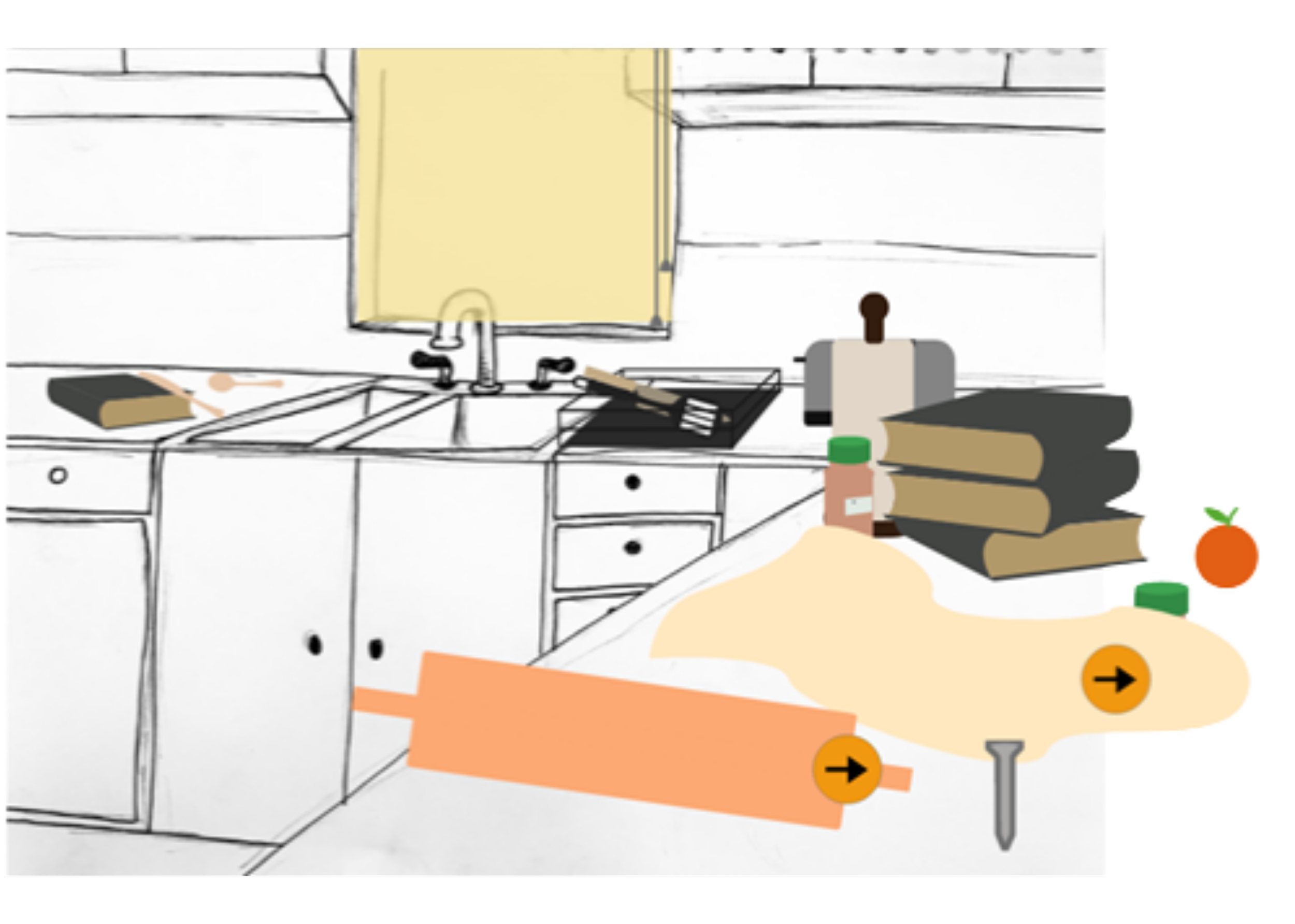 First and foremost, we didn’t have enough objects to play with. As you can see in Figure 1, there were only a few objects the screw could interact with (namely the rolling pin, seasoning bottles, and the orange). As such, the players had fewer potential solutions and were not as intrigued.