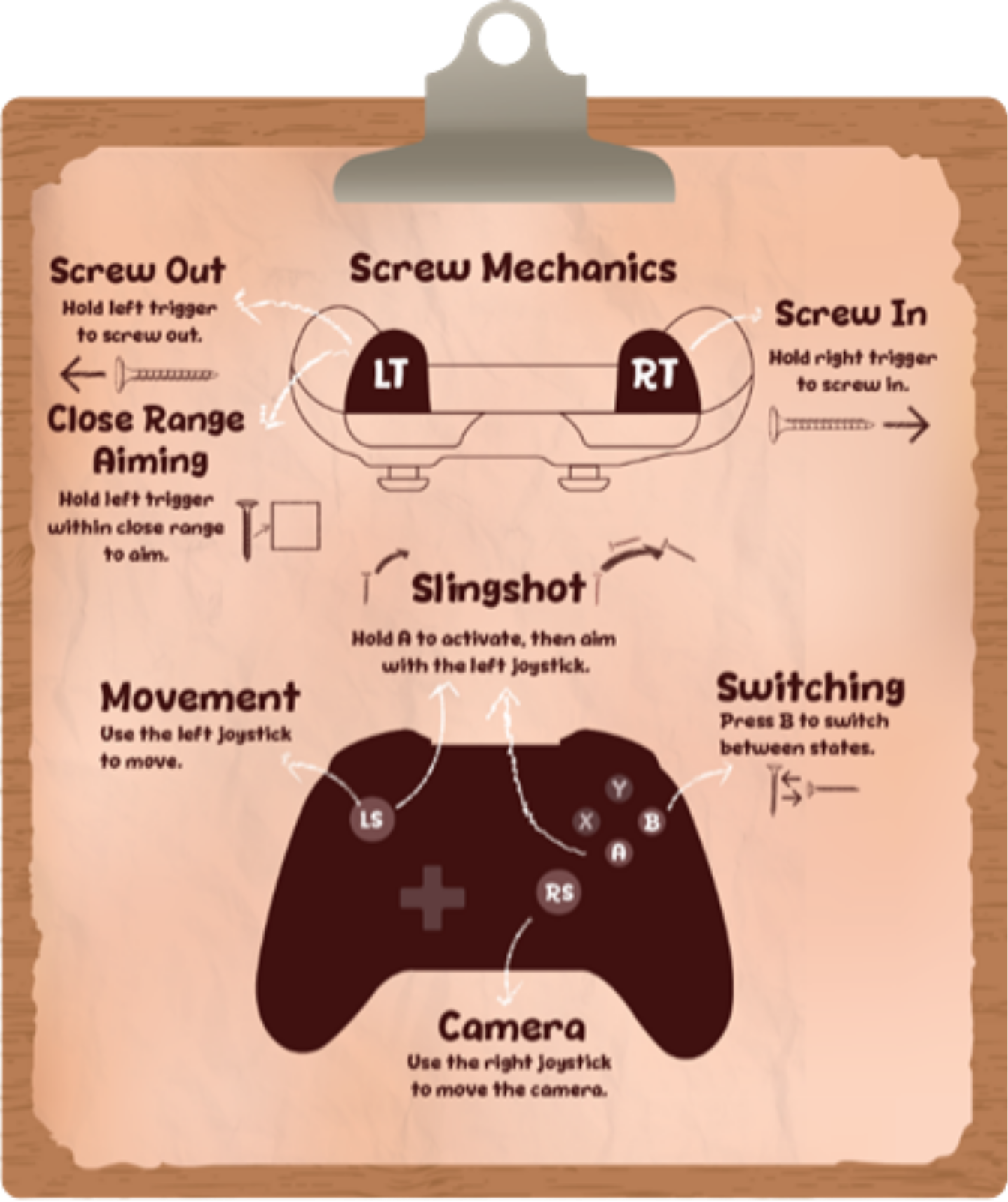 Our initial idea was to use the right joystick as a manual rotation input, turning it right to screw in and left to screw out. While this worked conceptually, testing revealed that the repetitive motion could be uncomfortable and tiring. Additionally, the right stick proved far more valuable when reserved for movement. From there, we decided to keep screwing in on the right side of the controller and screwing out on the left side, preserving the real-world logic without the physical strain.